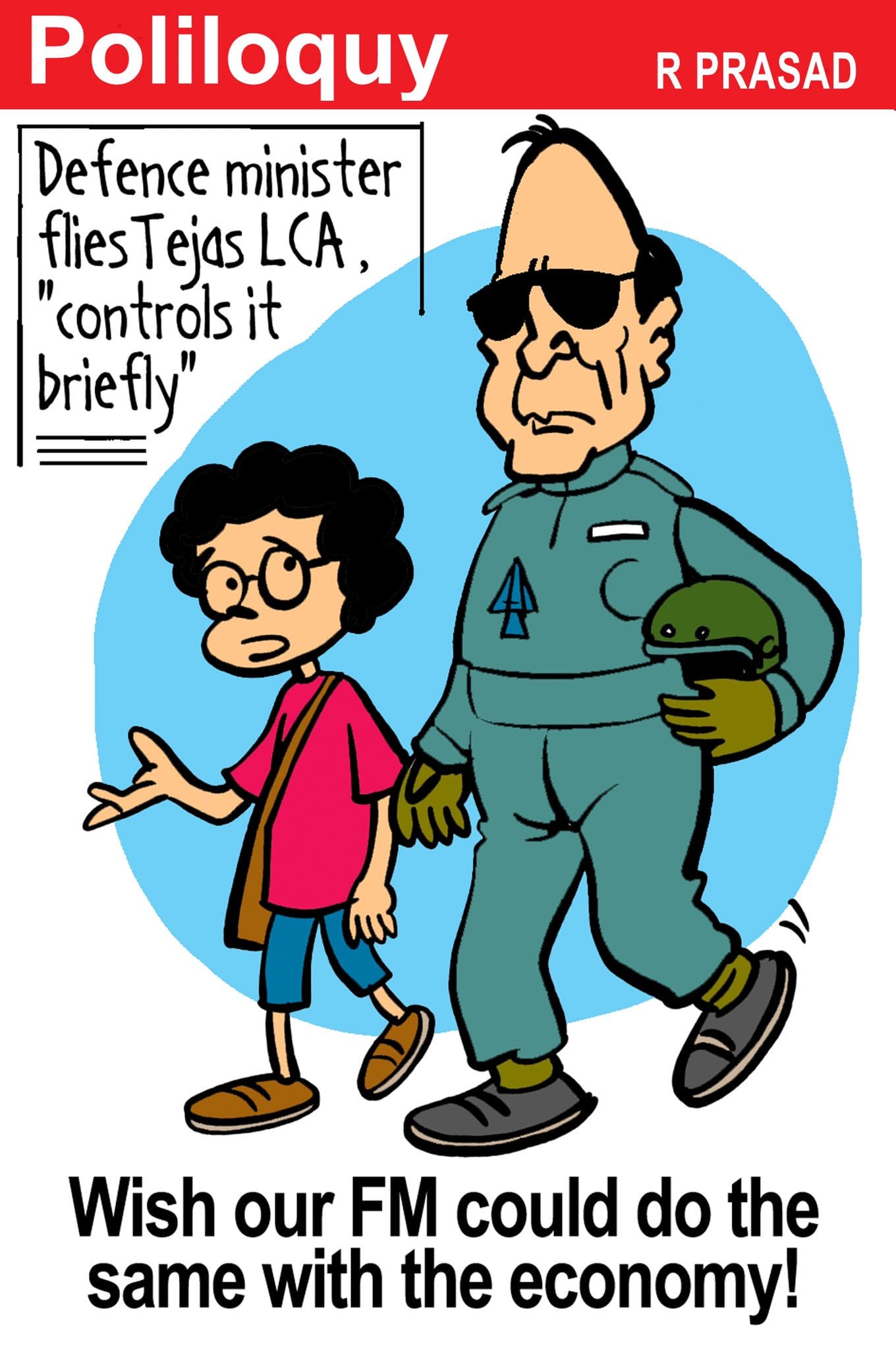 Union Minister Rajnath Singh made BJP proud by becoming the first defence minister to fly the indigenous Tejas fighter jet. But R. Prasad points out that considering the current state of India’s economy, our finance minister should aim for the sky too.
