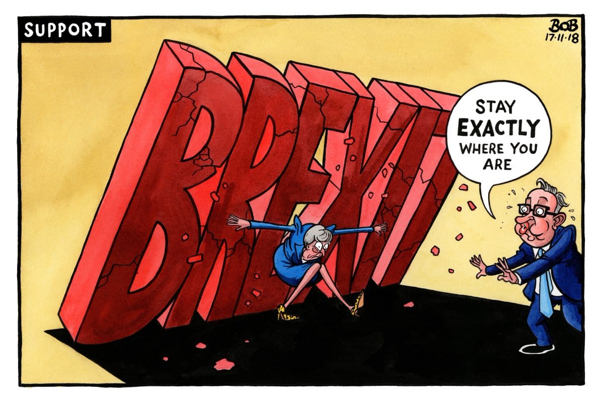 In The Telegraph, Bob Moran depicts UK Prime Minister Theresa May’s struggles to hold up Brexit, after several of her cabinet colleagues quit.