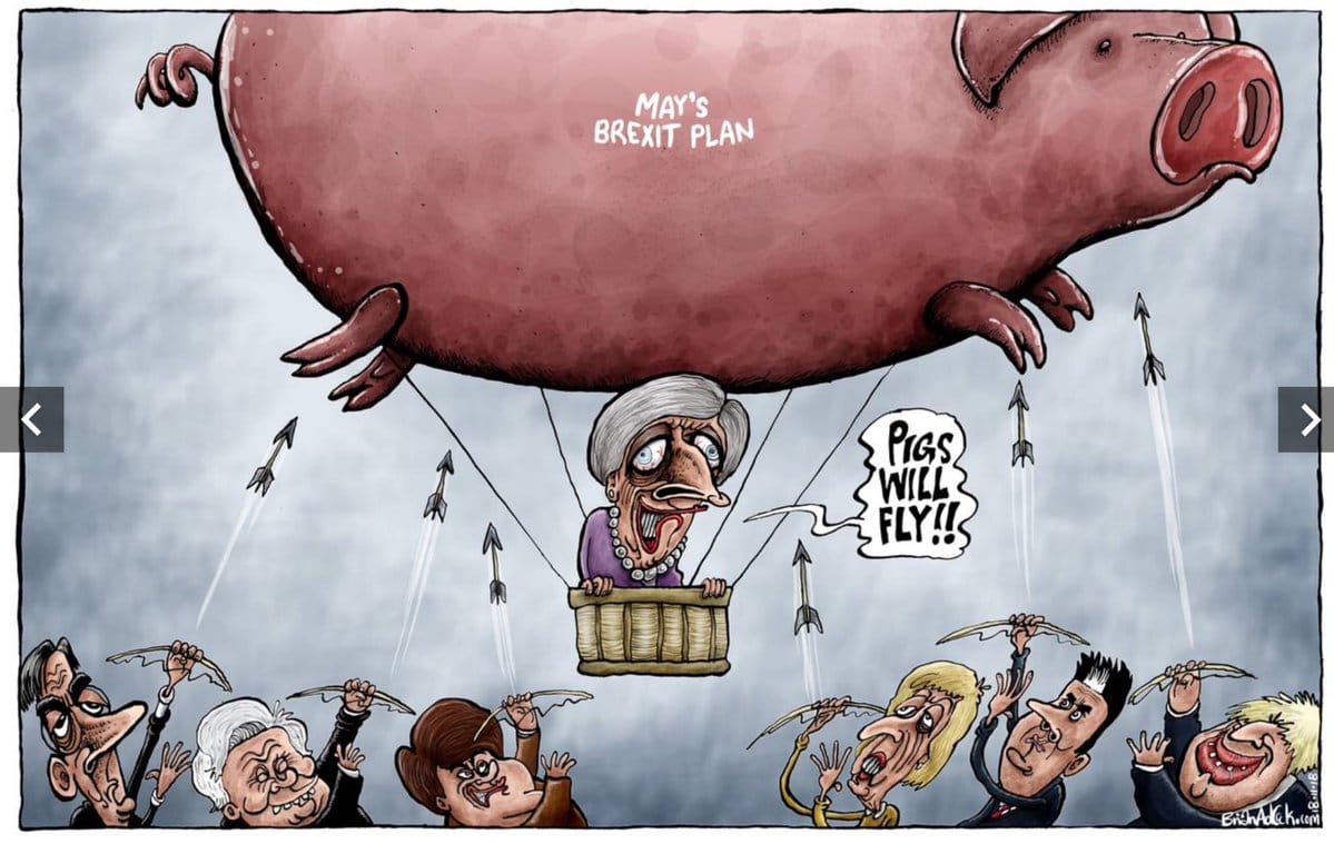 In The Independent, Brian Adcock thinks Theresa May’s Brexit plan is impossible to achieve, and depicts cabinet ministers trying to deflate the ‘flying pig’.