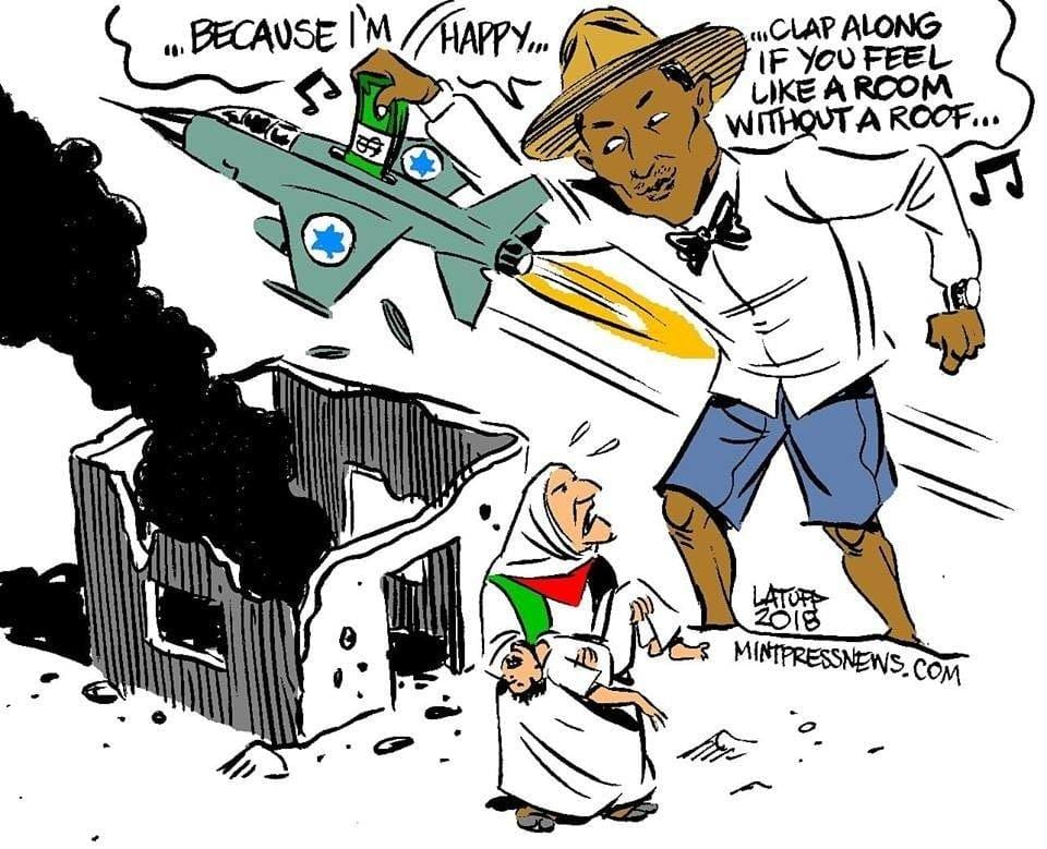 Carlos Latuff uses the lyrics from Pharrell Williams’ famous song ‘Happy‘ to condemn Israel’s bombing of Palestine, which has left many Palestinians homeless, and the US’ continued military aid to Israel.