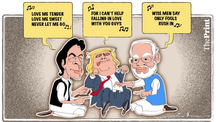 In today’s featured cartoon, ThePrint’s in-house cartoonist Arindam Mukherjee depicts Pakistan PM Imran Khan, US President Donald Trump and Indian PM Narendra Modi crooning Elvis Presley songs ‘Love me Tender’ and ‘Can’t Help Falling in Love’. Trump had compared Modi to the legendary rockstar after seeing the energy of the crowd at last Sunday’s ‘Howdy, Modi!’ event in Houston. The cartoonist also wanted to highlight the two prime ministers’ admiration and friendship with Donald Trump, and their ability to amuse the US president.