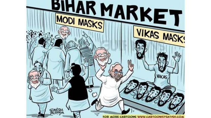 In today’s featured cartoon, Satish Acharya takes a dig at the election campaign that is heating up in Bihar with incumbent Chief Minister Nitish Kumar, perhaps, still banking on Prime Minister Modi’s popularity to win.