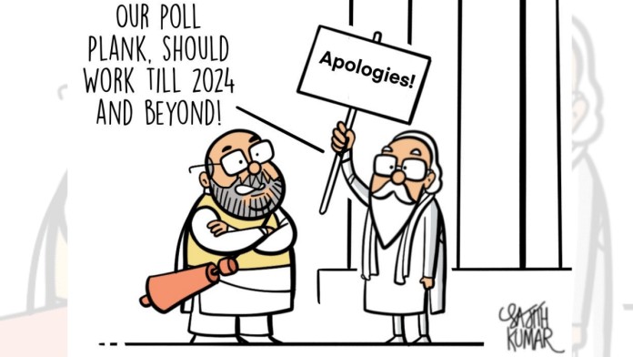 In today’s featured cartoon, Sajith Kumar refers to Narendra Modi’s apology while repealing the three farm laws, depicting the PM suggesting to Home Minister Amit Shah that this could be the BJP’s strategy in the run-up to the 2024 general elections.