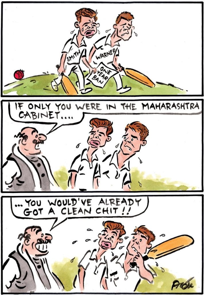 Steve Smith and Dave Warner’s fall from cricketing fame continues to provide material for humour. In Alok Nirantar’s cartoon for the Sakal Media Group, an MLA from Maharashtra tells them that they should have been in the Maharashtra cabinet, because then they would have already gotten a clean chit for corruption. In the past, CM Fadnavis has defended his cabinet ministers who were embroiled in bribery cases.