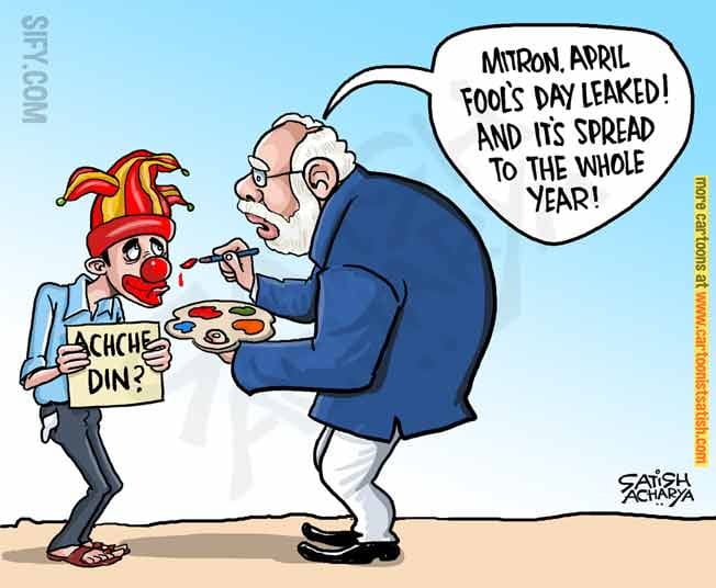 This April Fool’s day, different kinds of ‘frauds’ seem to be the underlying theme of illustrations. In the lead cartoon, Satish Acharya in Sify pokes fun at PM Narendra Modi’s promises of “Achhe Din,’ which have fooled the country because even April Fool’s has leaked and spread to the rest of the year.