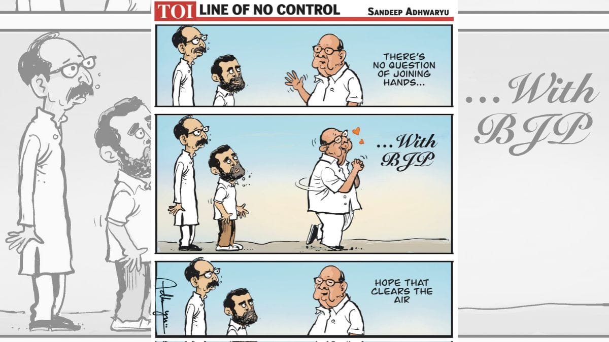 Sandeep Adhwaryu’s cartoon reflects the concerns that Sharad Parwar’s allies Rahul Gandhi and Udhhav Thackeray might have over the veteran leader’s recent meetings with nephew Ajit, who recently split Senior Pawar’s Nationalist Congress Party (NCP) and aligned with the BJP government in Maharashtra.