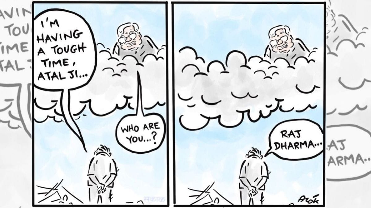 On Atal Bihari Vajpayee’s death anniversary, Alok’s cartoon depicts a visibly dejected man having a conversation with the former prime minister. The man, representing “Raj Dharma”, expresses difficulty, in a clear reference to Vajpayee’s advice to Modi during the 2002 Gujarat riots when he was chief minister of the state.