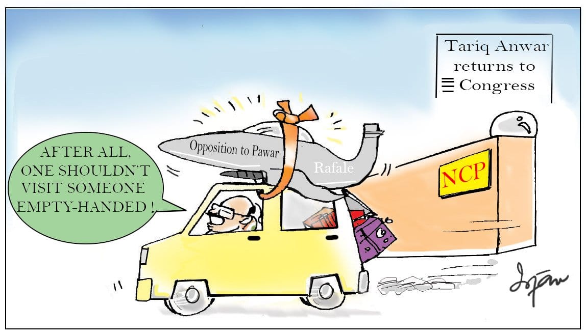 Cartoonist Irfan illustrates Tariq Anwar’s return to Congress from NCP after 19 years. Anwar blamed NCP Sharad Pawar defending PM Modi on the Rafale deal for his decision.