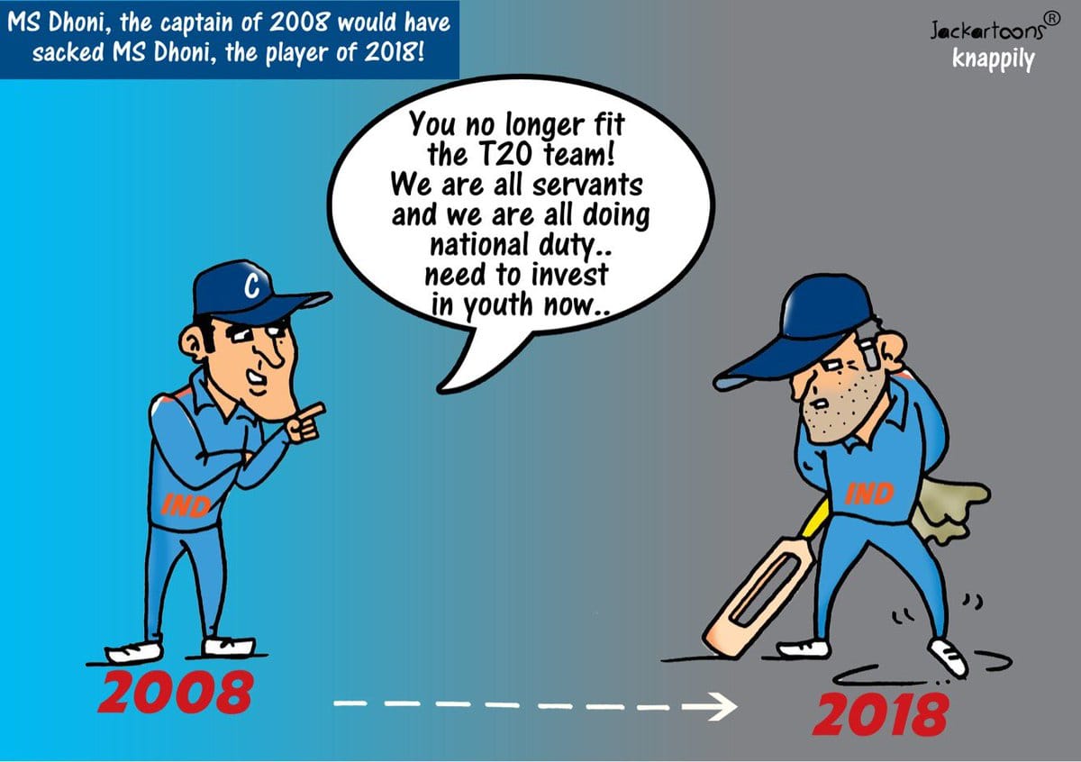 Jackartoons takes a swipe at Dhoni, who earlier had reputation for dropping senior players over poor performances, in the wake of the former captain being omitted from the 16-member squad for the upcoming T20 series.