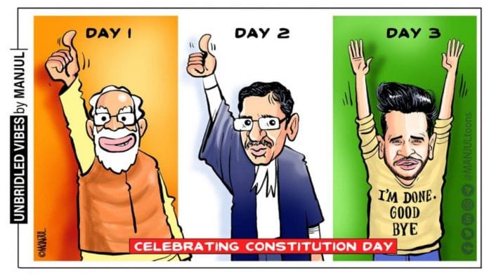 In today’s featured cartoon, Manjul juxtaposes the case of comedian Munawar Faruqui, who indicated he that may perform anymore, after over 12 of his shows were cancelled due to threats, against India’s Constitution Day celebrations on 26 November.