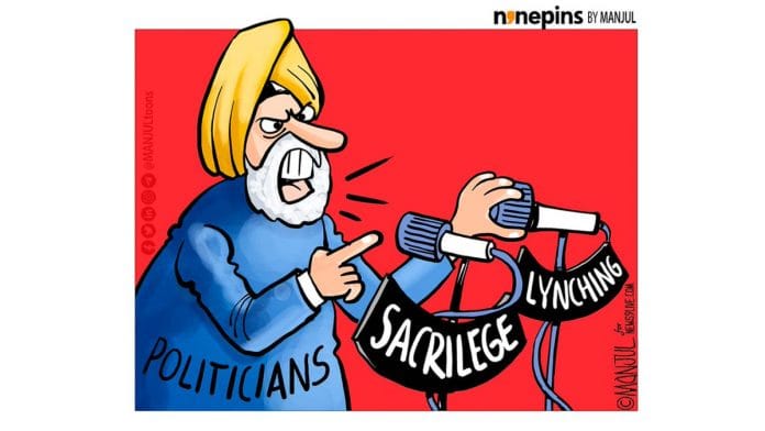 In today’s featured cartoon, Manjul alludes to the lynching of two persons accused of ‘sacrilege’ in separate incidents in Punjab, and the fact that while several political leaders have publicly condemned the alleged desecration, they have said little on the killings.