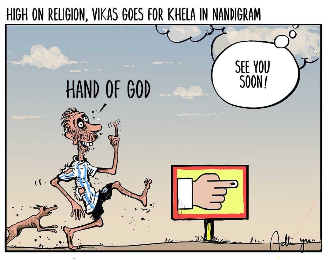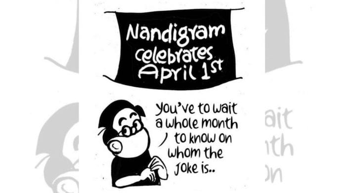 In today’s featured cartoon, E.P. Unny illustrates the hotly contested second phase of the West Bengal assembly elections in Nandigram, on the occasion of April Fools’ Day.