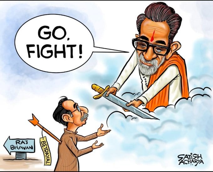 Satish Acharya also refers to the rebellion by Shiv Sena MLAs led by Eknath Shinde that led to former CM Uddhav Thackeray’s resignation, while alluding to Governor Bhagat Singh Koshyari ordering a floor test to determine the majority in the state assembly “within 24 hours” of receiving a request from the BJP.