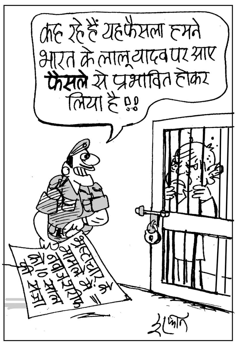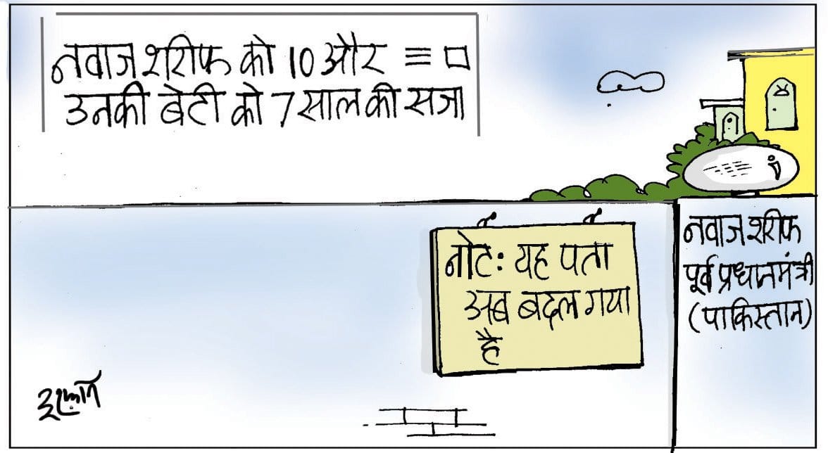 In Jansatta, cartoonist Irfan also references the corruption conviction of Nawaz Sharif, and suggests that the Pakistani authorities may have been inspired by the jailing of Rashtriya Janata Dal leader, Lalu Prasad Yadav, on similar charges.
