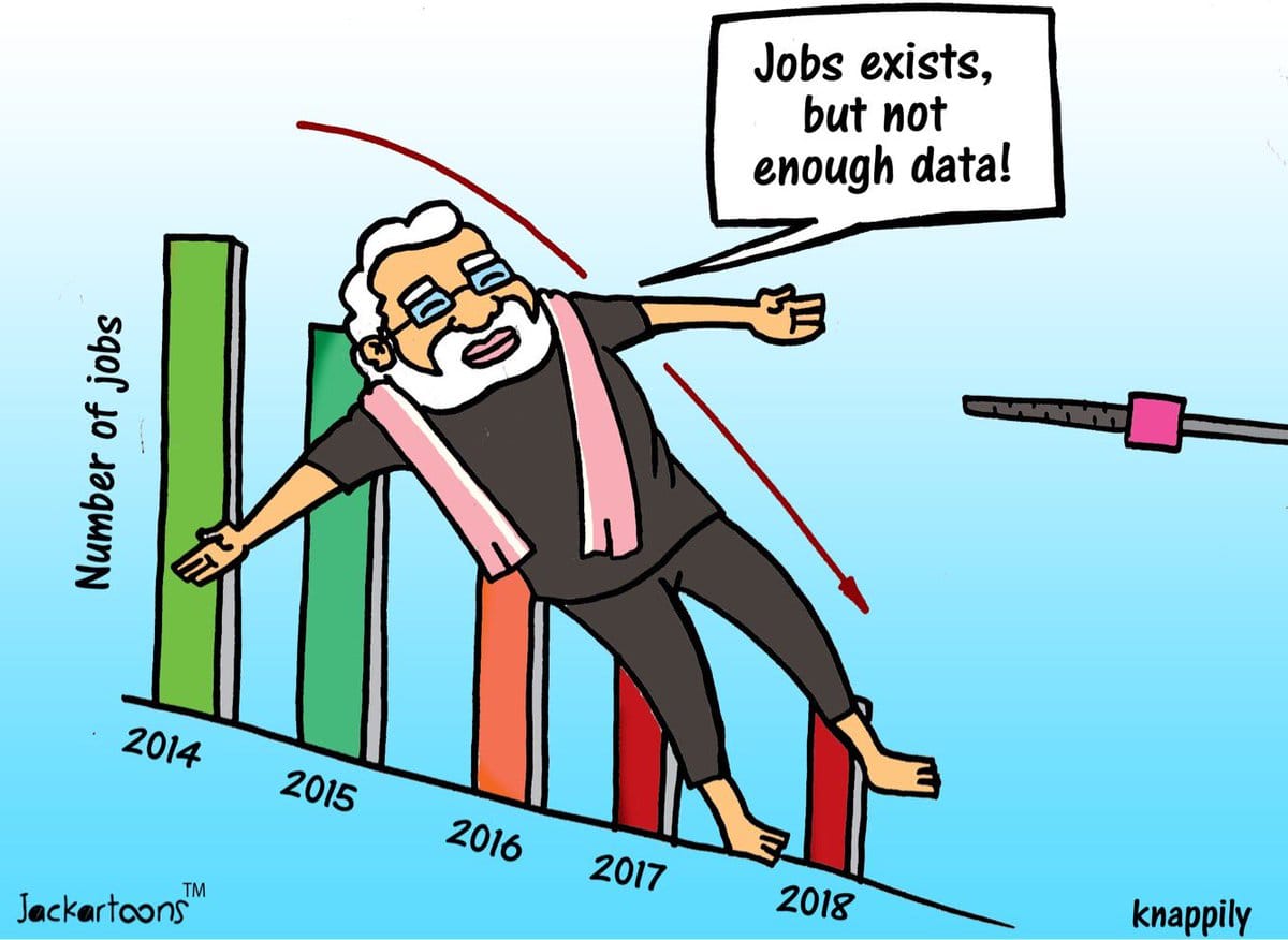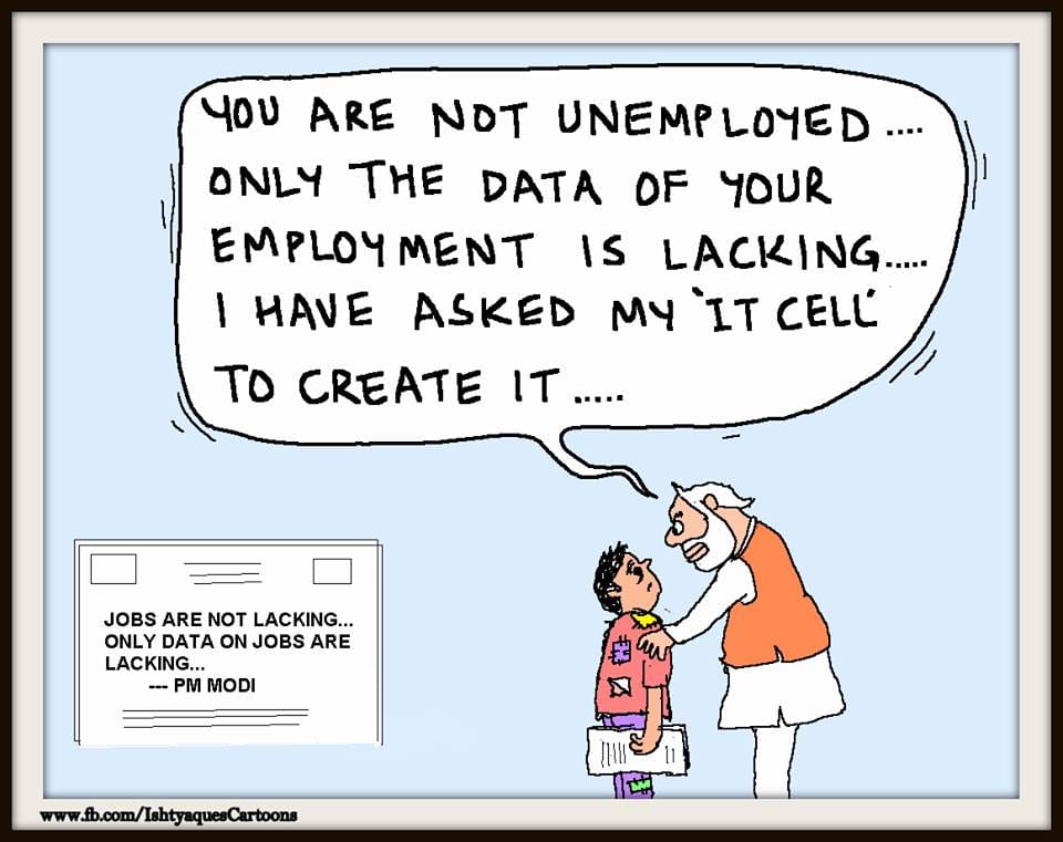 Cartoonist Sanket continues with the same theme, mocking the Prime Minister on his comment on unavailability of job data.