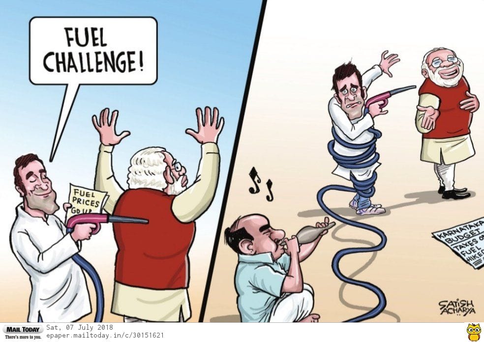 In Mail Today, Satish Acharya appears to illustrate that the Karnataka government’s decision to hike petrol and diesel prices, has put Congress president Rahul Gandhi in a spot, as he had been taking on the NDA government over rising fuel prices.