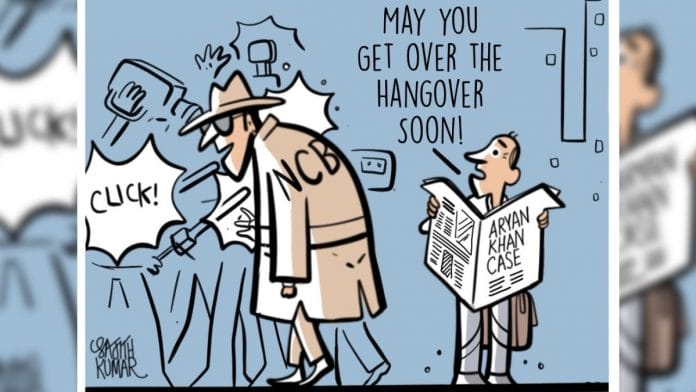 In today’s featured cartoon, Sajith Kumar mocks the Narcotics Control Bureau, signifying that it is high on its newfound spotlight in the Aryan Khan case. Bollywood megastar Shah Rukh Khan’s son Aryan was arrested on 2 October in an alleged drug bust on a cruise ship, and was granted bail Thursday by the Bombay High Court.