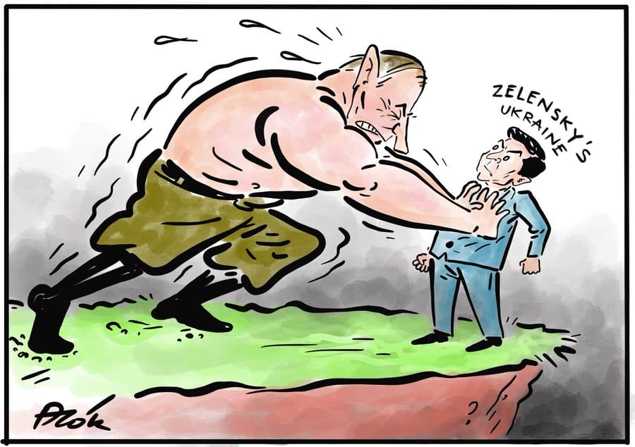 Alok Nirantar also draws on the Russia-Ukraine conflict and illustrates Ukrainian President Volodymyr Zelenskyy — whose resistance has earned him worldwide attention —holding his ground against the bigger and more powerful Russian President Vladimir Putin.