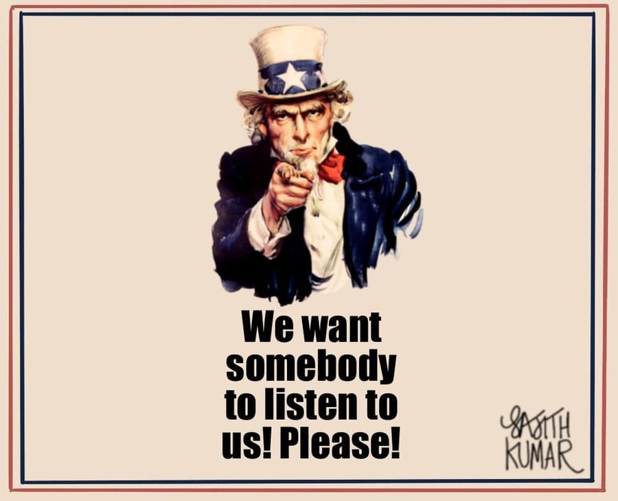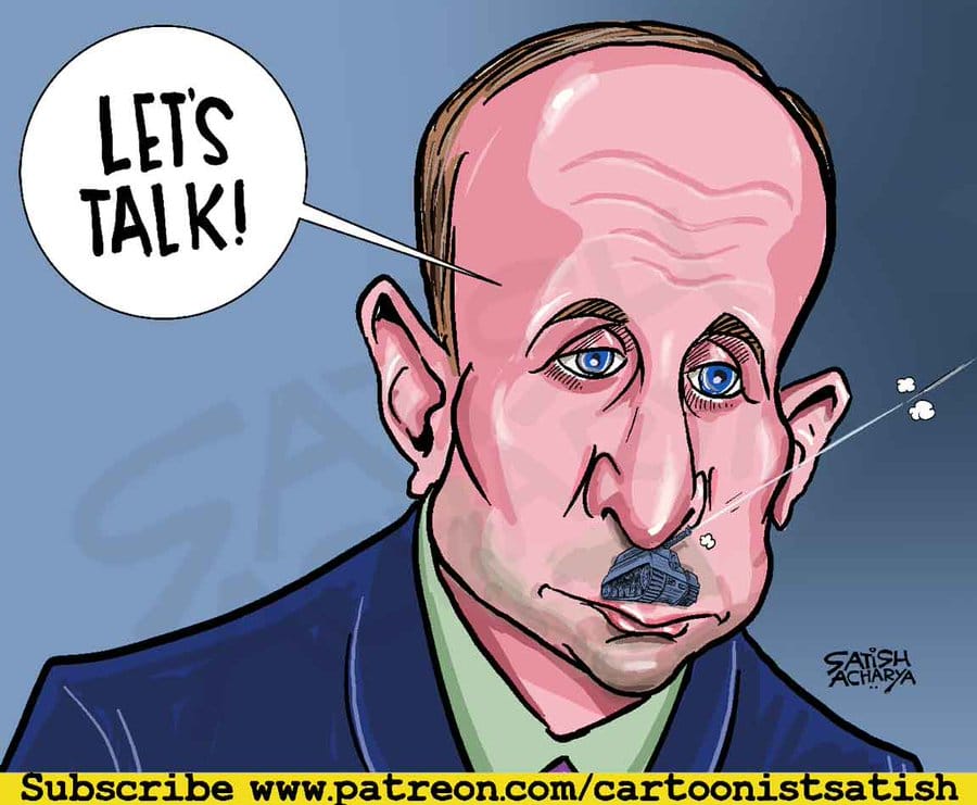 Satish Acharya refers to Russia’s offer to hold talks — now ongoing — with Ukrainian officials in Belarus, while there has been no halt to its military campaign. The tank-moustache is an obvious reference to Adolf Hitler.