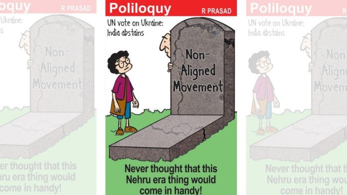 In today’s featured cartoon, R. Prasad alludes to India’s abstention from a UN Security Council vote on a resolution condemning Russia for its invasion of Ukraine. This was far from a first for New Delhi, which made similar decisions several times during the Cold War when it was a leader of the Non-Aligned Movement.