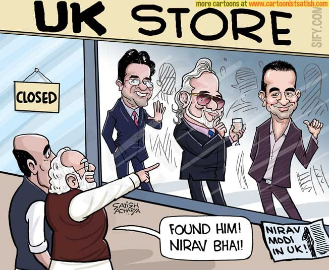 United Kingdom authorities confirmed the presence of Nirav Modi in their country, reacting to which the Central Bureau of Investigation has sent an extradition request. In Sify, cartoonist Satish Acharya suggests all fugitive billionaires, including Vijay Mallya and Lalit Modi, are now in the UK showroom.