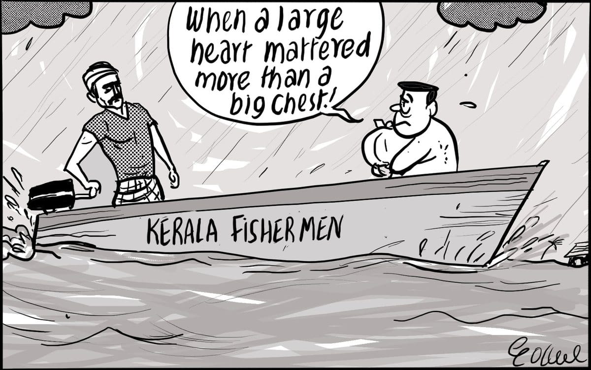 Kerala fishermen played an important role in the rescue of the flood victims, even refusing to accept the financial reward offered to them by the Kerala government. On the other hand, the central government, headed by big-chested Prime Minister Narendra Modi, did not offer enough support. In The Asian Age, cartoonist Gokul says the fishermen showed a big heart.