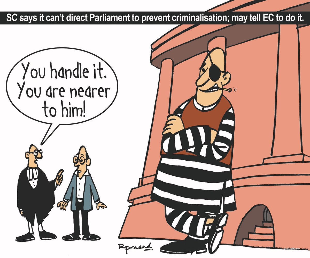 Cartoonist R. Prasad takes a dig in The Economic Times at the Supreme Court after it looked to pass the buck to the Election Commission saying that it might consider asking the political parties to get their members disclose the criminal charges against them, if any.