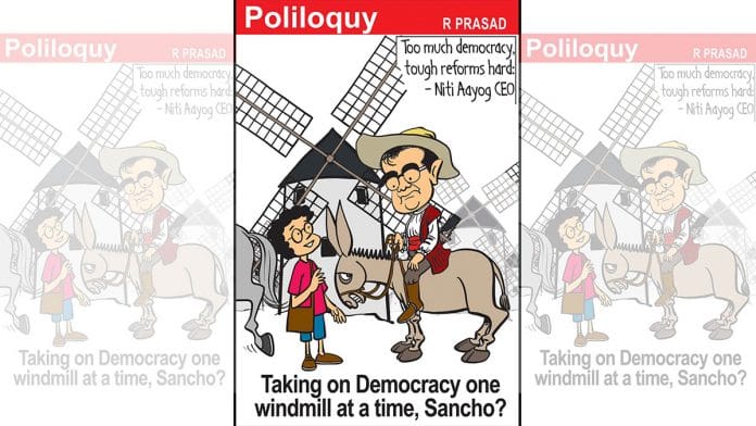In today’s featured cartoon, R. Prasad compares Niti Aayog CEO Amitabh Kant’s ‘too much democracy’ statement to literary hero Don Quixote’s famous fear of windmills. In the seminal Spanish novel by Miguel de Cervantes, the eponymous hero and his squire Sancho Panaz attack windmills believing them to be “hulking giants”. Since then, the phrase ’tilting at windmills’ has been used to refer to imaginary enemies.