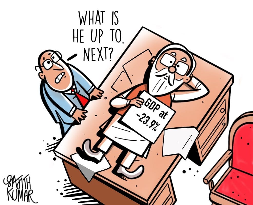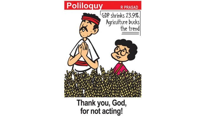 In today’s featured cartoon, R. Prasad comments on the the growth of agriculture despite the record contraction of the GDP in the April-June quarter to -23.9 per cent.