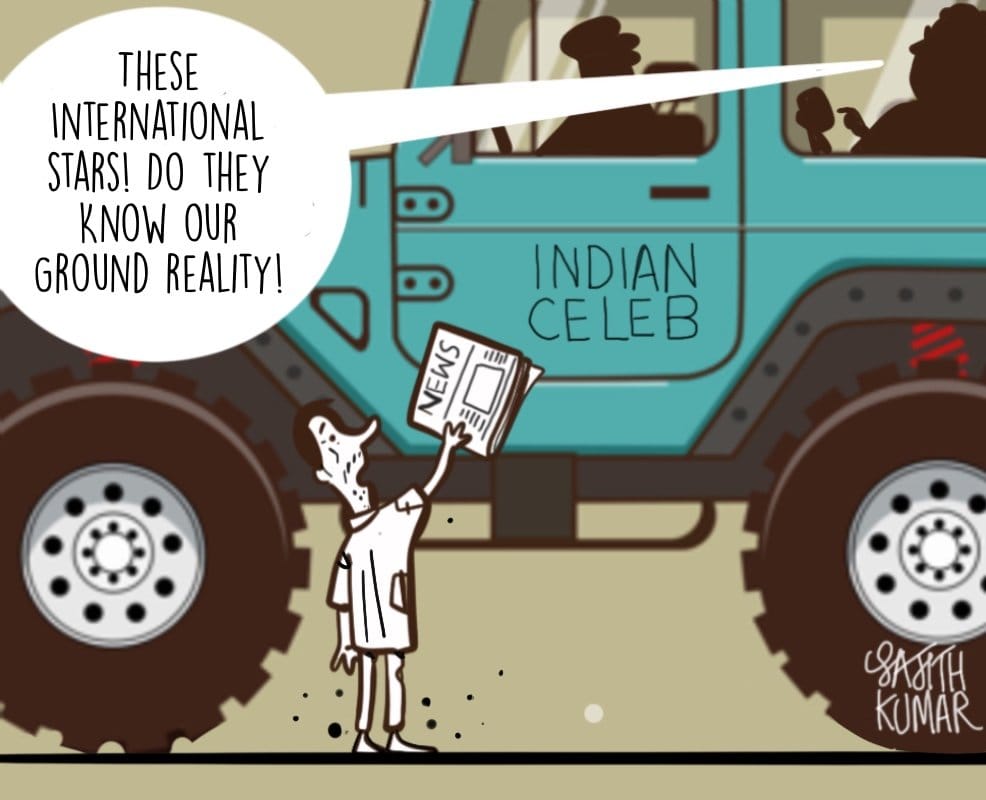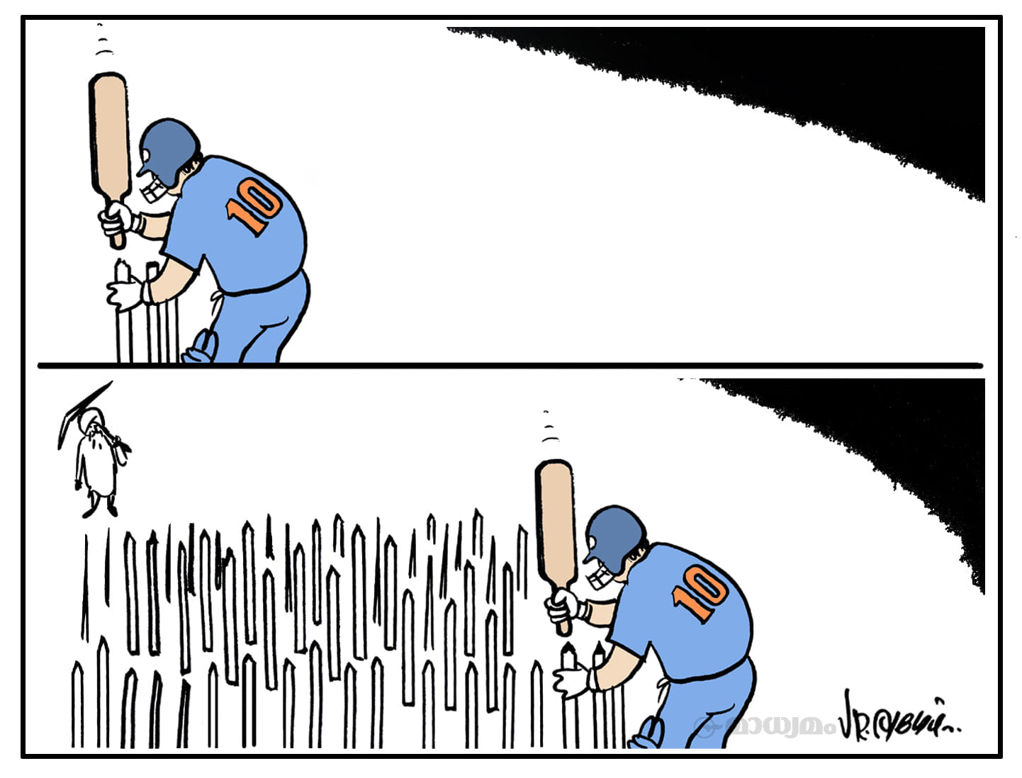 Cartoonist V.R. Ragesh similarly comments on cricketers coming out in support of the government. But Ragesh puts special focus on cricketing legend and former Rajya Sabha MP Sachin Tendulkar’s tweet.
