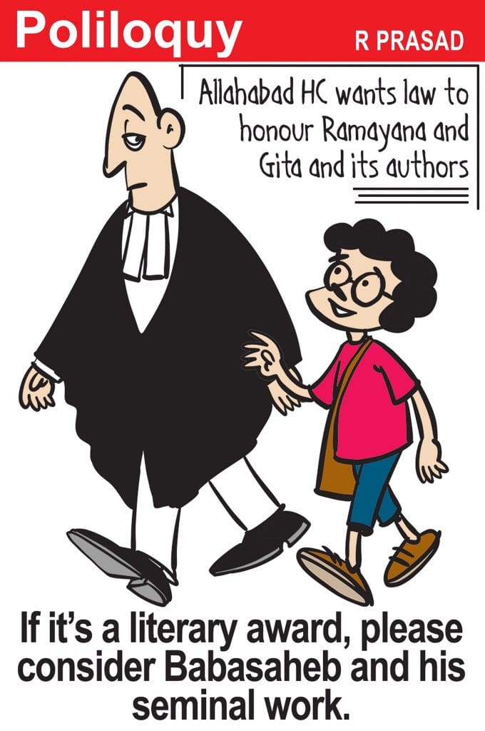 R. Prasad has a tongue-in-cheek take on the Allahabad High Court’s observation that Parliament should introduce a law to grant “national honour” to Hindu gods Ram and Krishna, and sages Valmiki & Ved Vyas, who wrote ‘Ramayana’ and the ‘Bhagavad Gita’ respectively. The cartoonist advises the judge to extend the “national honour” to Dr B.R. Ambedkar and his “seminal work”, the Constitution of India.