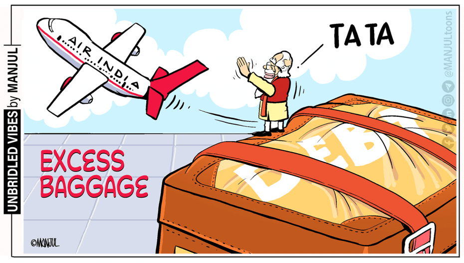 Manjul puns on ‘excess baggage’ in air travel to refer to Air India’s debt of Rs 61,560 crore as the Tatas take over the airline from the Modi government.