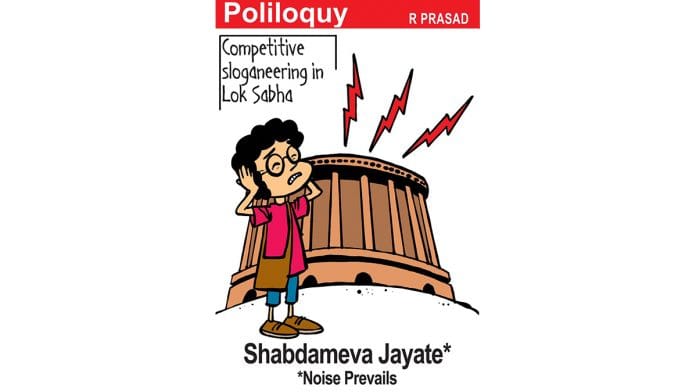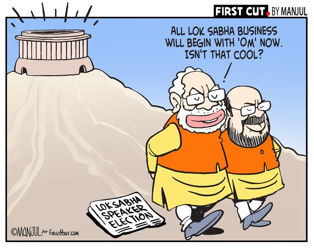 In today’s featured cartoon, R. Prasad reworks India’s national motto, ‘Satyameva Jayate’ (truth alone prevails), to take a potshot at the ‘competitive sloganeering’ of Members of Parliament with religious chants during the oath-taking of some MPs.