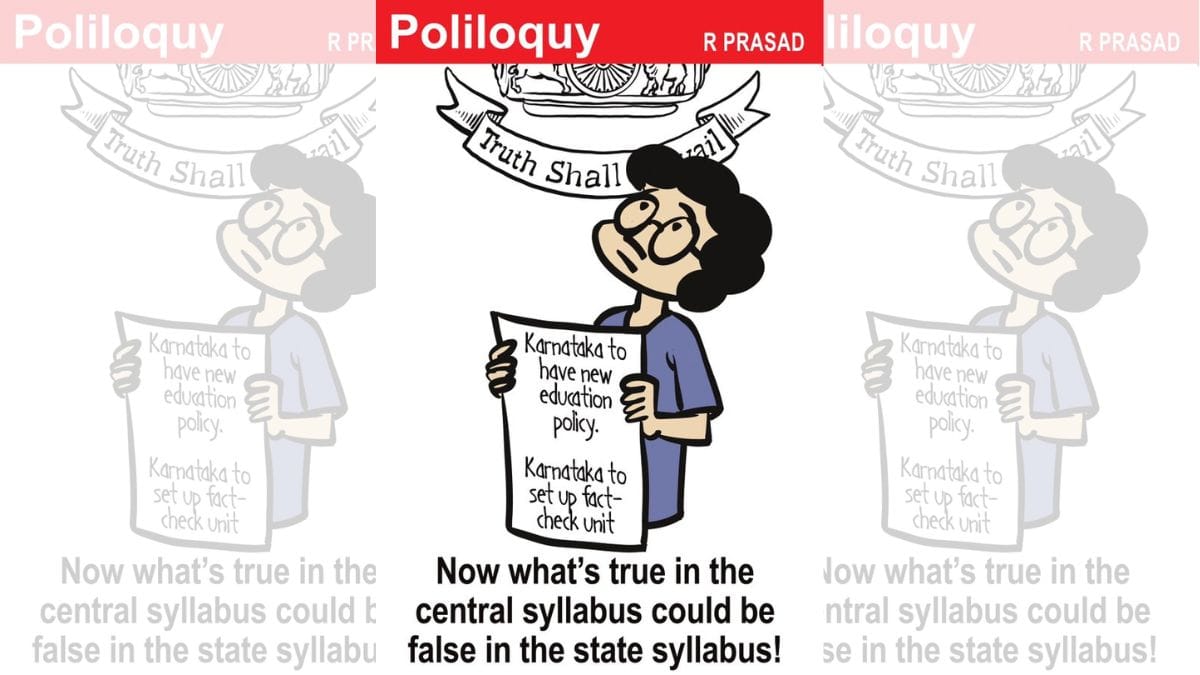R. Prasad gives a satirical take where he shows a girl with a sign announcing “New Education Policy” and a “Fact Check Unit” in Karnataka, highlighting the inconsistency between central and state syllabuses. The cartoon reflects the absence of a unified education policy.