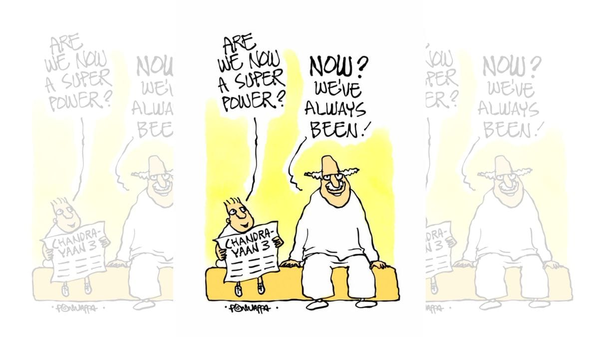 Nala Ponnappa’s cartoon humorously depicts a young child holding a newspaper with HL reading — Chandrayaan 3 and asking if India is now a superpower, to which the man responds, “Now? We’ve always been,” playfully asserting India’s ‘longstanding importance.’