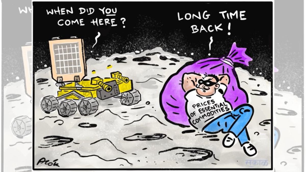In Alok Nirantar’s cartoon, following India’s triumphant Chandrayaan-3 mission to the moon, the Pragyan rover can be seen engaging in a playful exchange symbolizing the soaring prices of essential commodities like vegetables and petrol, cleverly addressing the ongoing issue with a touch of lunar humour.