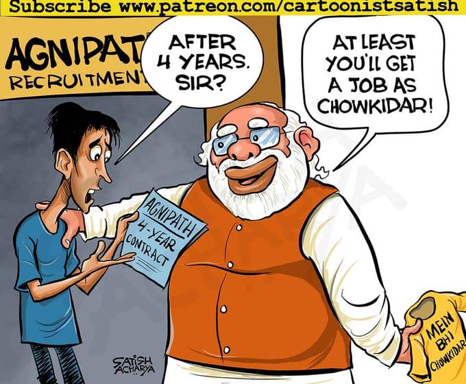 Referring to how only 25 per cent of those recruited under the Agnipath scheme will be absorbed by the armed forces as career soldiers after a tenure of four years, Satish Acharya reiterates concerns raised by prospective ‘Agniveers‘ about their future prospects, while alluding to the the Bharatiya Janata Party’s 2019 campaign slogan Main bhi chowkidar (‘I too am a watchman’).