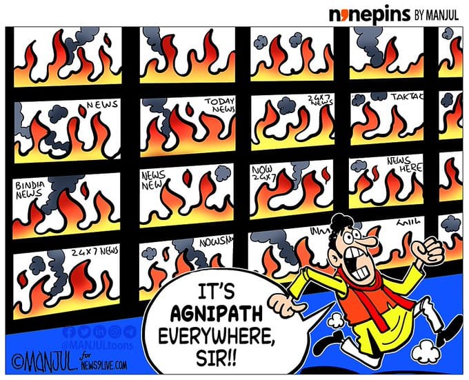 Manjul, too, refers to the scale of violent demonstrations against the central government’s Agnipath (‘path of fire’) scheme, which have spread to parts of Bihar, Haryana, Uttar Pradesh, and Telangana.