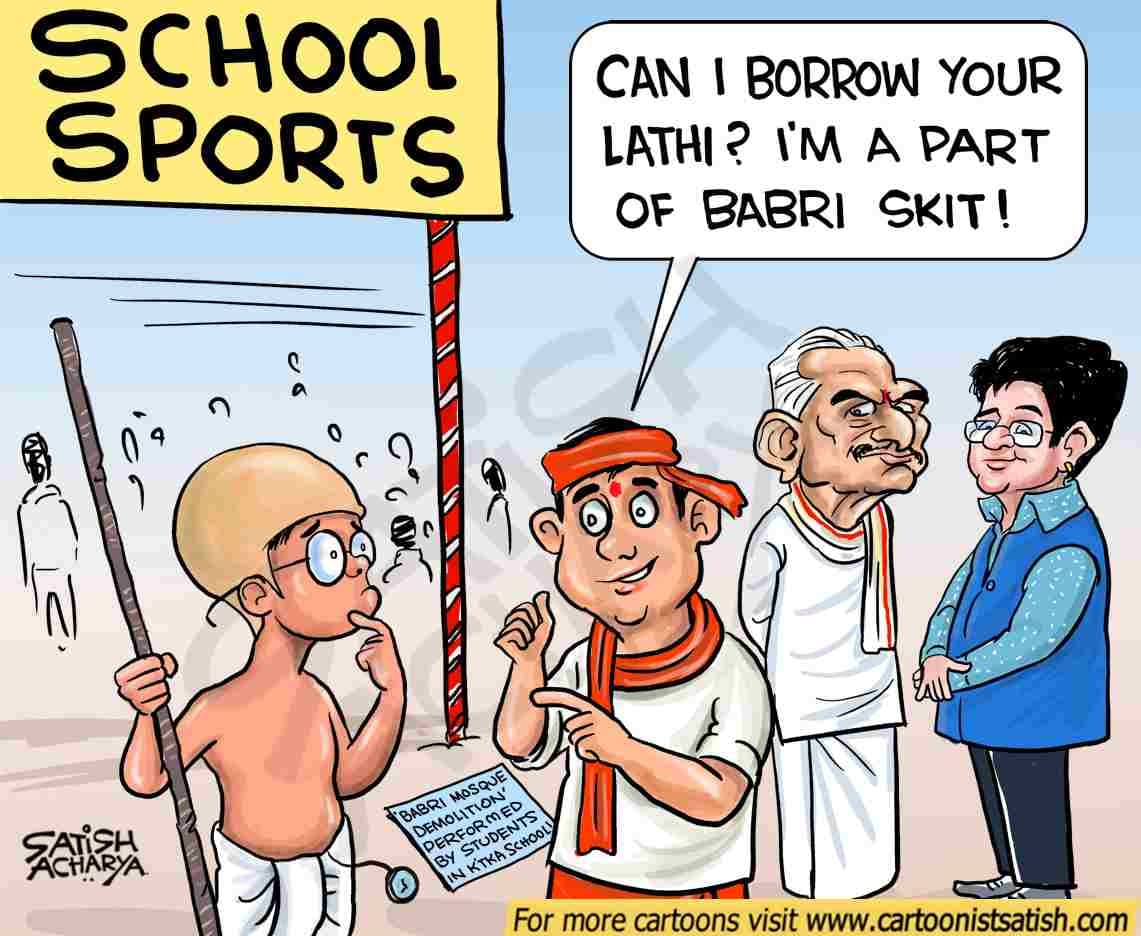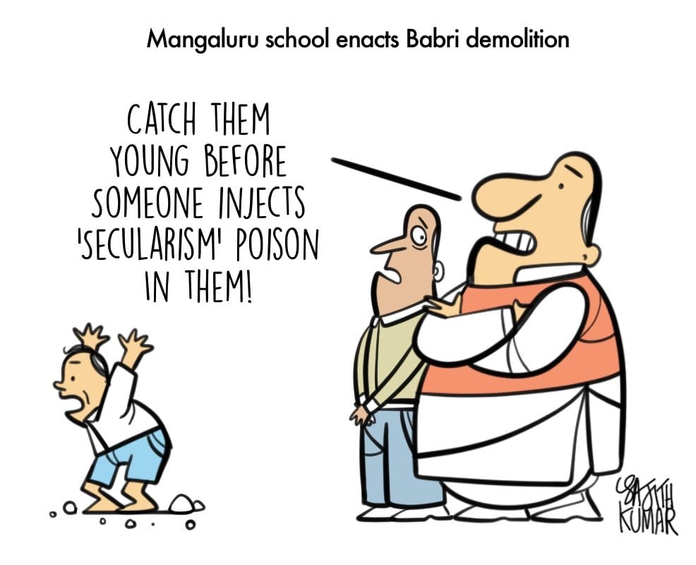 Satish Acharya satirises the incident that occurred in a school in Mangaluru where students enacted out the Babri masjid demolition.