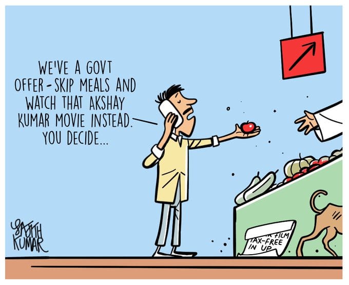 Sajith Kumar mocks various state governments for declaring actor Akshay Kumar’s new film Samrat Prithviraj tax-free while seemingly turning a blind eye to surging prices of essential commodities, including tomatoes.