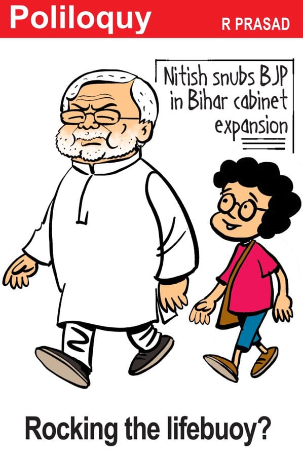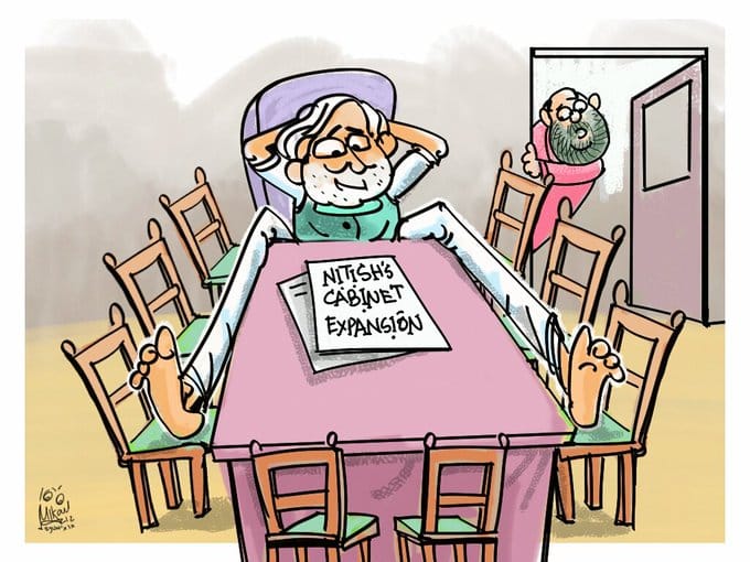 R. Prasad, for The Economic Times, weighs in on Bihar Chief Minister Nitish Kumar’s cabinet expansion Sunday with eight new faces – all from his Janata Dal (United). Members of JD(U) allies, the BJP and LJP, were left out from the cabinet expansion. Kumar was apparently upset after his party was offered only a single berth in the Narendra Modi cabinet.