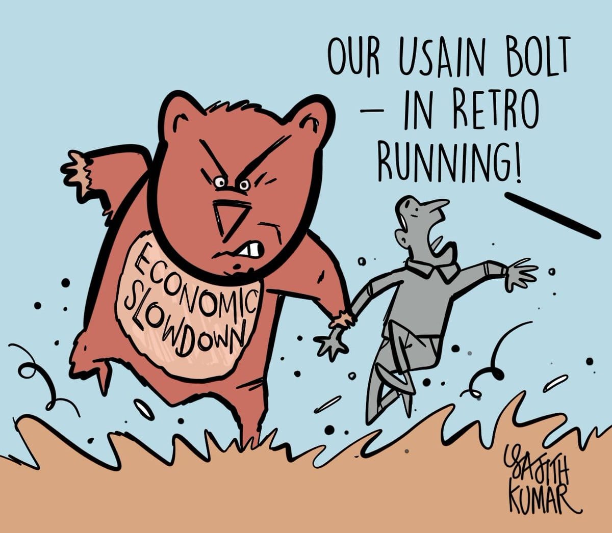 Sajith Kumar hints at the country’s economic slowdown with a satirical cartoon that depicts Kambala jockey Srinivas Gowda, who took national media by storm by allegedly breaking Usain Bolt’s record during a traditional buffalo race in Karnataka.