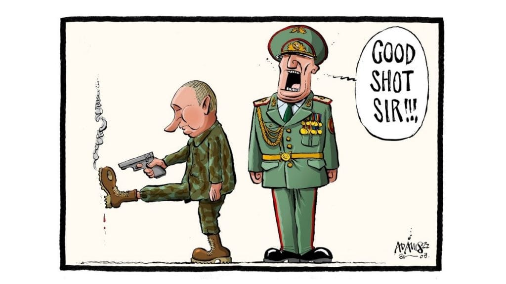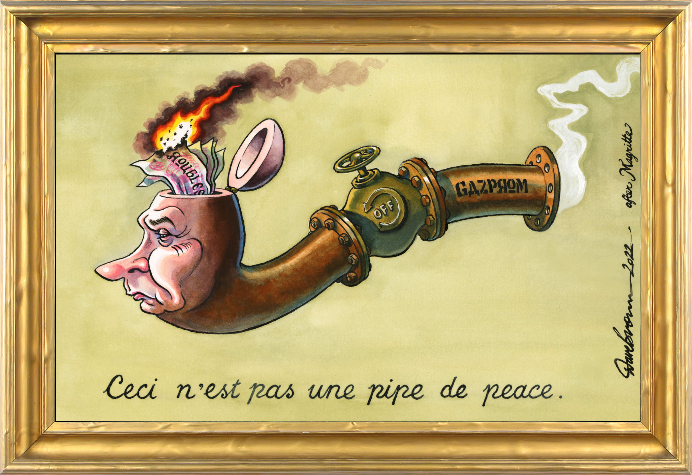 Dave Brown alludes to Belgian surrealist painter René Magritte’s 1929 work ‘The Treachery of Images’, on which the artist wrote “Ceci n’est pas une pipe“, which is French for “this is not a pipe”. Brown comments on Putin’s order to halt Russian gas supply unless foreign buyers pay for it in roubles, by saying “this is not a pipe of peace”.