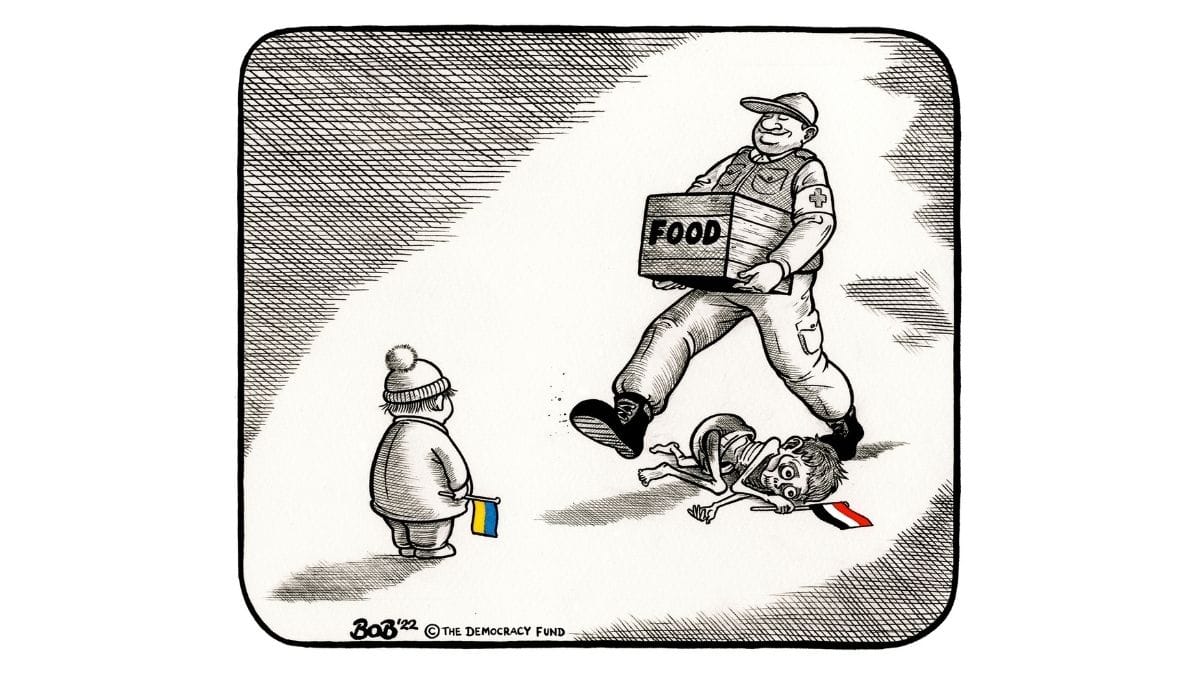 As more human rights organisations come in aid of displaced Ukrainian children since the Russian invasion, Bob Moran highlights the plight of Yemeni children who reel under grave humanitarian crisis since the war broke out in 2014. At least 10,200 Yemeni children have been “killed or maimed” since the war began.