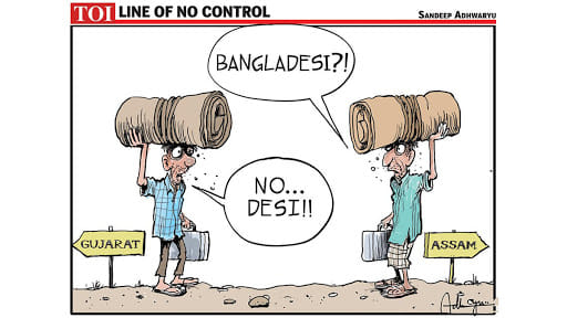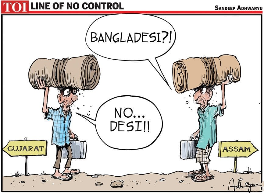 In The Times of India, Sandeep Adhwaryu takes a jibe at the recent events in Gujarat. The cartoonist compares the exodus of migrant workers from the state to the situation in Assam where several lakhs are facing a crisis due to the National Register of Citizens (NRC) issue.
