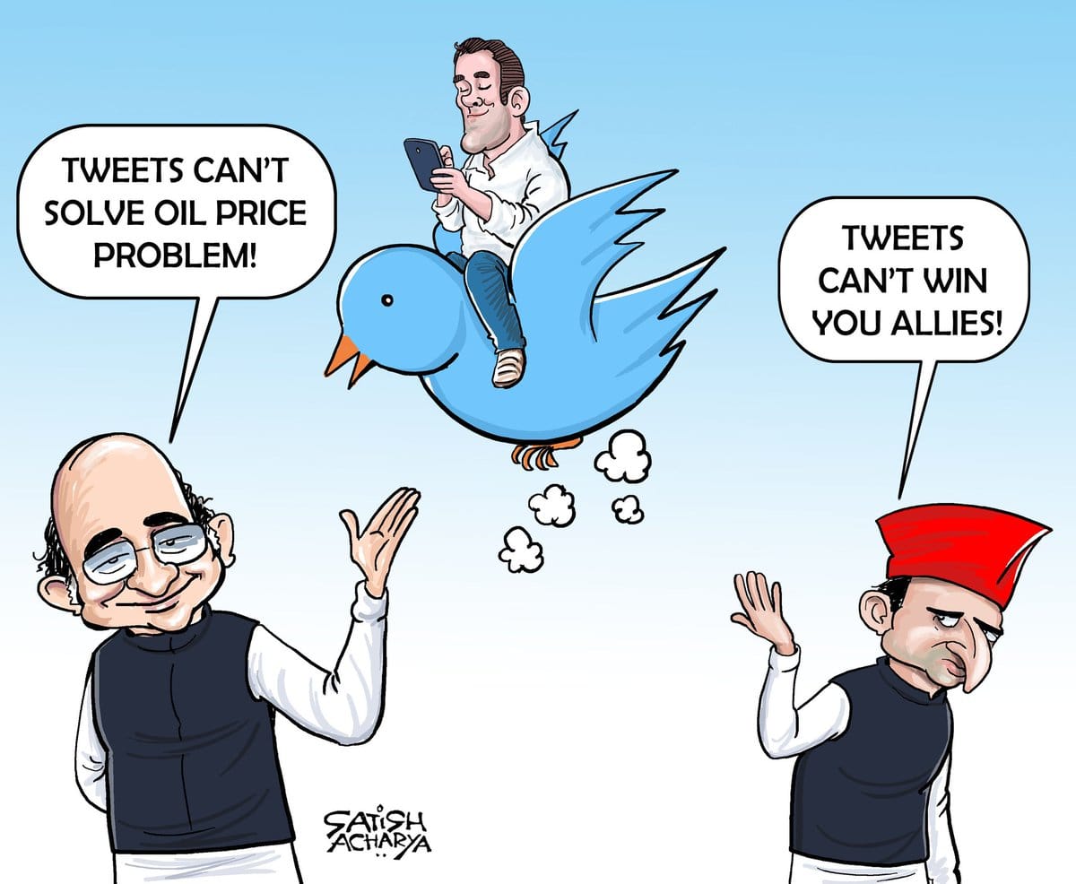 Satish Acharya pokes fun at Congress chief Rahul Gandhi after he was left alone by Akhilesh Yadav and Mayawati ahead of the Madhya Pradesh elections. Finance minister Arun Jaitley, too, recently took a swipe at Gandhi saying that tweeting can’t solve issues.