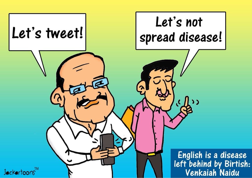 Jackartoons takes a jibe at Vice-President M. Venkaiah Naidu’s remarks on English at an event organised on the occasion of ‘Hindi Divas’ in New Delhi. He had said English was a disease left behind by the British.