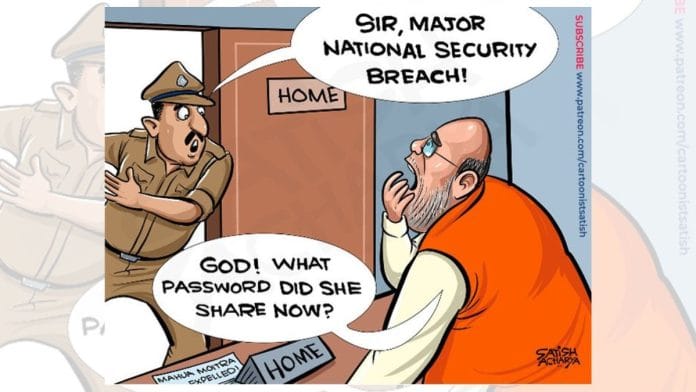 In today’s featured cartoon, Satish Acharya engages in clever commentary on the recent security breach in Parliament involving two people from the visitors’ gallery. The double entendre in the ‘security breach’ refers to Mahua Moitra’s expulsion from the Lok Sabha for sharing her password with someone who is not an MP.
