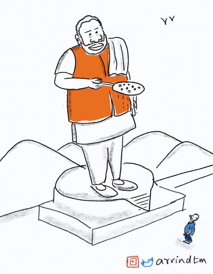 With reports suggesting that unemployment rate in India touched a 45-year high, Aravinda Tegginamath takes a jibe at Prime Minister Narendra Modi, highlighting his ‘pakora selling’ advice to unemployed youth with an illustration of a statue of the PM folding a skimmer.