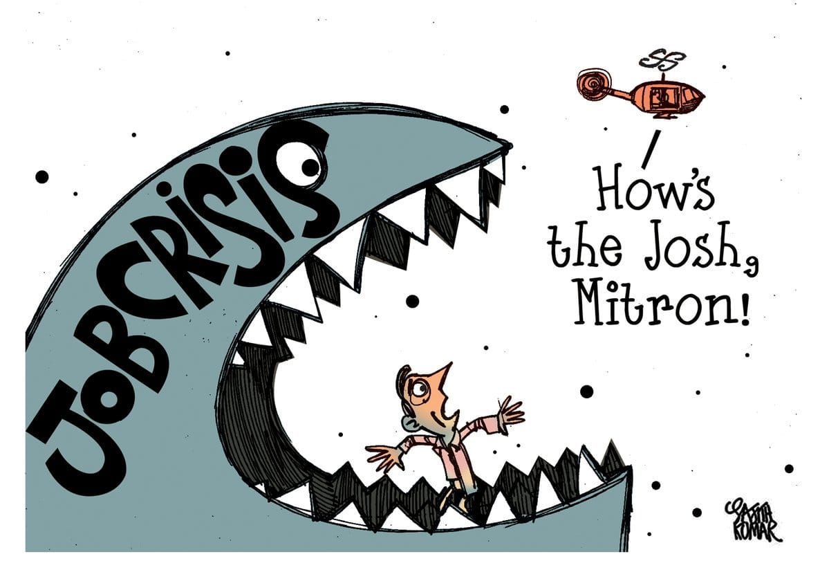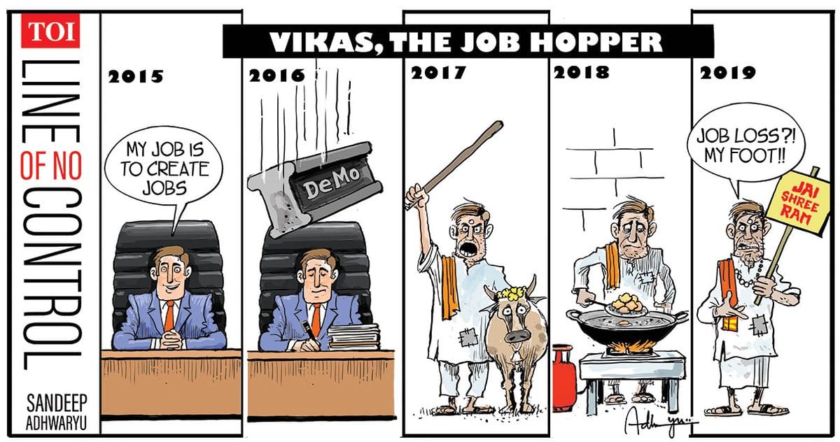Sajith Kumar also highlights the unemployment ‘wave’ with a depiction of PM Modi in a chopper trying to boost the morale of the unemployed youth.
